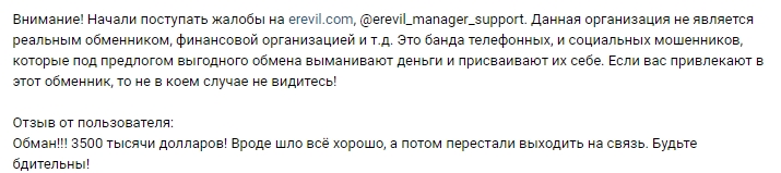 - Обменник erevil com является скамером, который ворует деньги.