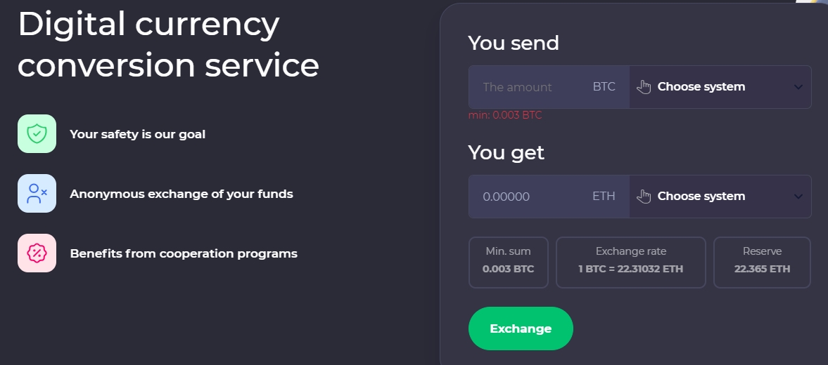 Сервис erevil com является обменником криптовалют. Сперва кажется, что сайт рассчитан только англоязычную аудиторию, т.к. создатели не позаботились выполнить перевод услуг на русский язык на главной странице. Сервис заявляет о безопасности данных клиентов, анонимности в процессе осуществления обмена, а также предлагает заработок на реферальных ссылках. На этой же странице размещена простая инструкция в четыре шага, сообщающая как провести сам обмен.