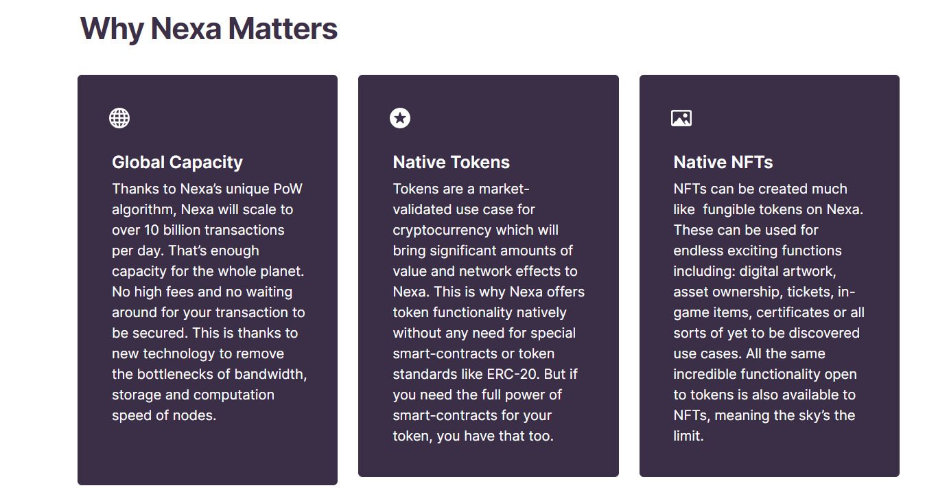 Nexa — платформа, содержащая информацию о токене Nexa coin, способах его применения и перспективах развития проекта. Монету можно добывать даже с помощью видеокарт, что могло бы стать плюсом, но интерес пользователей к процессу довольно низкий. В сети нет отзывов о платформе, а комментарии относительно майнинга нейтральные.