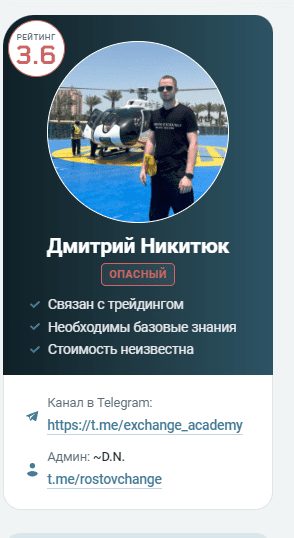 Дмитрий Никитюк — это блогер, который занимается криптовалютой и ведет Телеграм-канал под названием Rostovchange. Он пишет, что помогает людям торговать криптовалютами и учиться этому. Но в интернете есть много отзывов и анализов, которые говорят, что он аферист. Главный доход Дмитрия поступает не от торговли криптовалютами, а от черного брокера, который платит ему откаты. Из-за этого многие люди сомневаются в его честности и критикуют его.