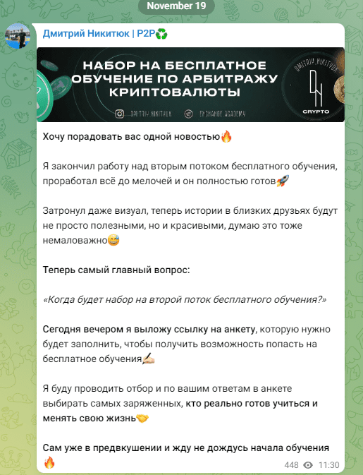 Этот бизнесмен говорит, что дает ссылку на курсы по трейдингу бесплатно, но когда люди просят ссылку, оказывается, что бесплатных мест нет и можно записаться только на платное обучение. Это создает впечатление, что его курсы очень востребованы. Он не говорит заранее, сколько стоят его видеокурсы, об этом можно узнать только в личных сообщениях. Это странно для профессионала, ведь обычно трейдеры все делают открыто.
