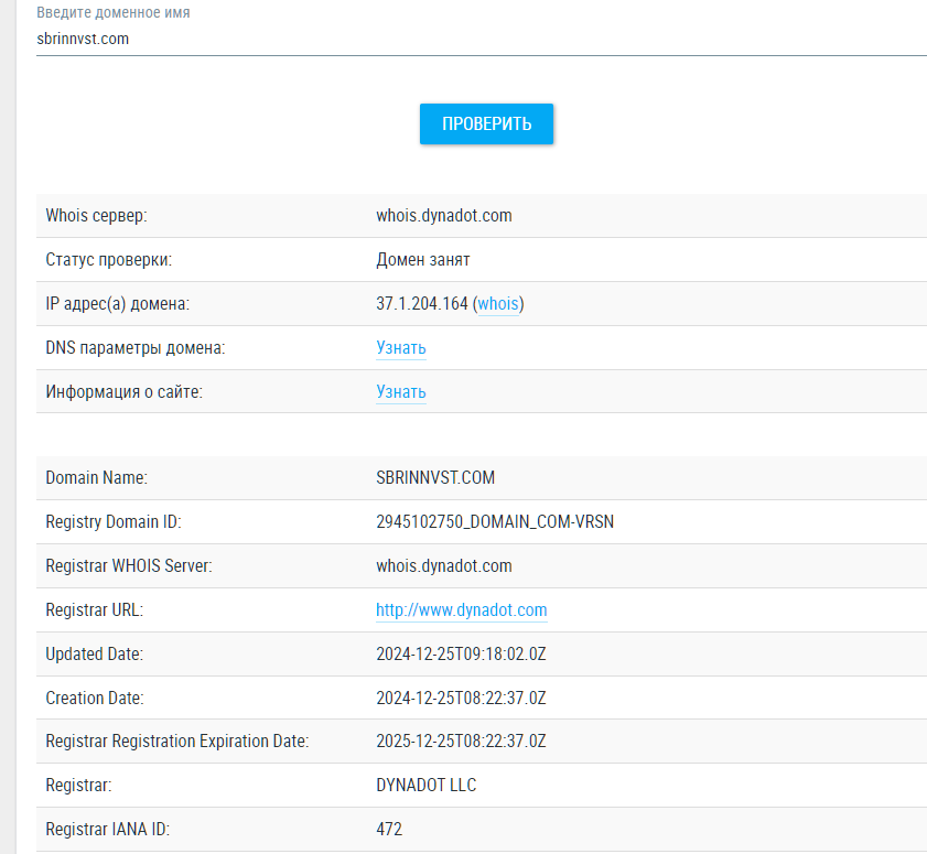 Проверим, https sbrinnvst com что за сайт, когда был зарегистрирован домен именно этого инвестиционного скам сервиса. Домен зарегистрировали в конце декабря 2024 года. Хотя на сайте утверждают, что успешно работают с 2000 года.
