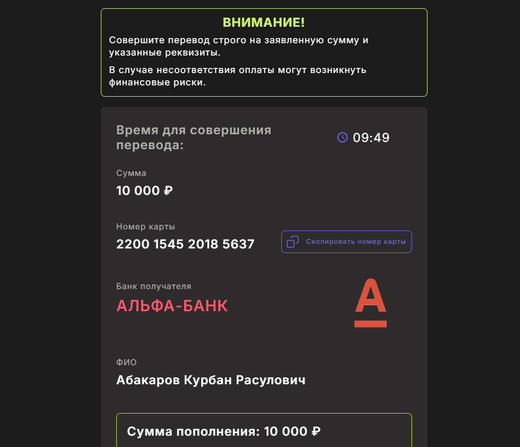 Минимальная сумма инвестиции 1000 рублей. Получается, что мы дарим неизвестному лицу, в данном случае Абакарову Курбану, 10 000 рублей. Доказать, что перевод был инвестицией будет невозможно, так как назначение платежа не указано.