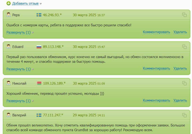 На независимых ресурсах о сервисе Grumbot net ходят только положительные отзывы от довольных трейдеров и инвесторов. Они удовлетворены курсами обмена крипты на фиат и в обратную сторону. Пользователи отмечают, что поддержка реагирует на проблемы клиентов и помогает их решать в течение часа.