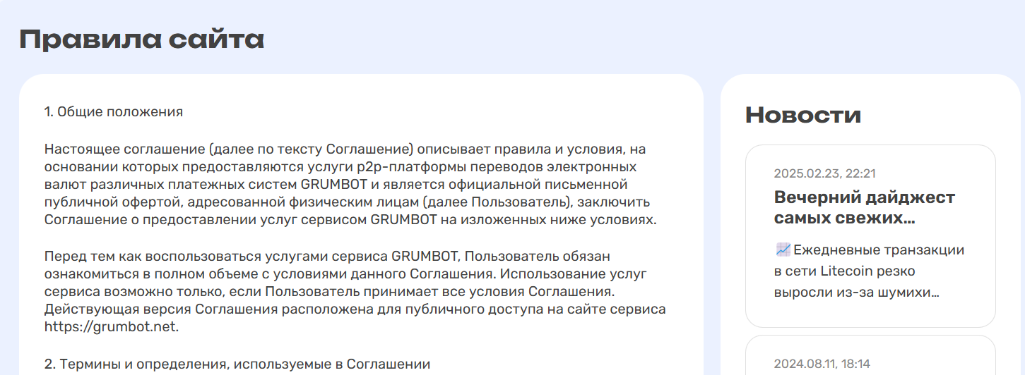 В верхней части сайта расположены кнопки, которые позволяют клиенту узнать новости рынка криптовалют, обновления обменника, произошедшие совсем недавно и ожидаемые. Пользователь сможет изучить инструкцию по работе с сервисом во вкладке «Правила».