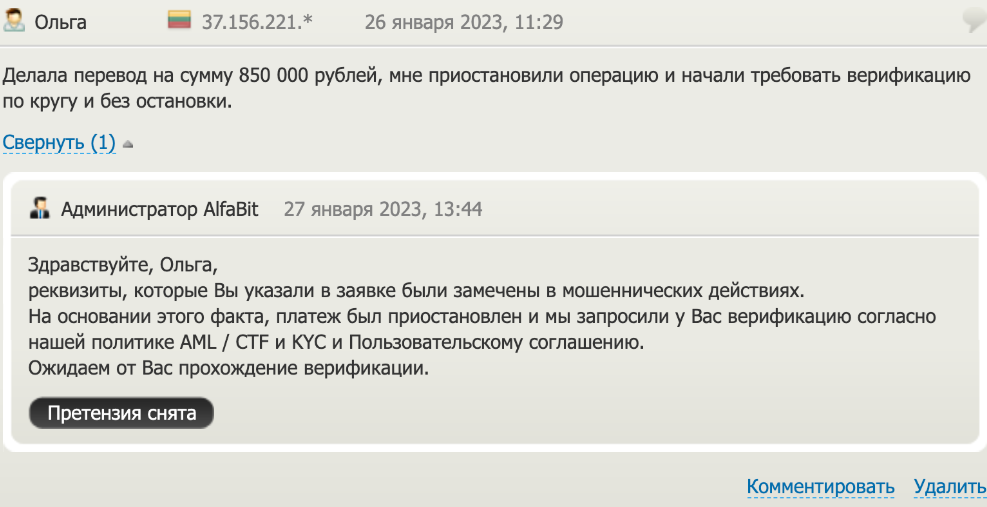 Есть и отрицательные отзывы о компании и телеграмм-боте обменника. Одна клиентка пишет, что ее транзакции остановили и потребовали верификации личности под видом якобы того, что она замешана в мошеннических действиях. Деньги ей так и не вернули, а верификацию она не смогла пройти.