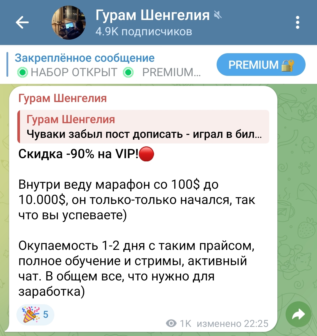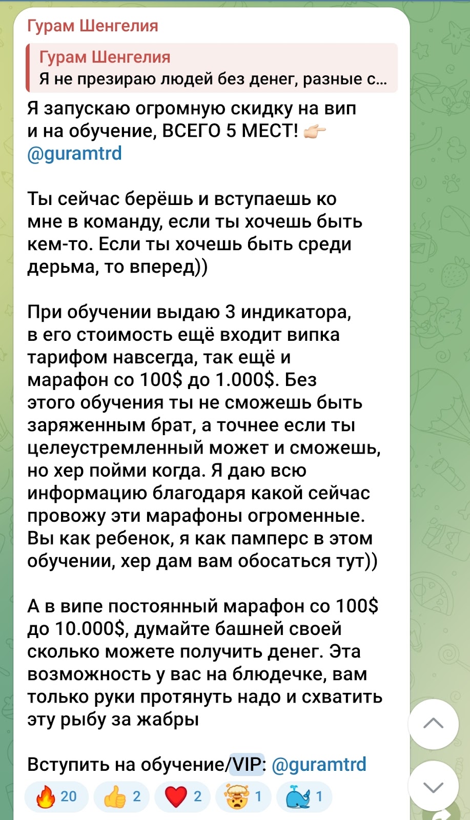 Еще одна услуга Гурама Шенгелии – курсы трейдинга. Кроме обучения, студенты получают бессрочный доступ в VIP сообщество. О цене и условиях учебы сведений нет. За информацией нужно обращаться в личный чат администратора Trade Guram.