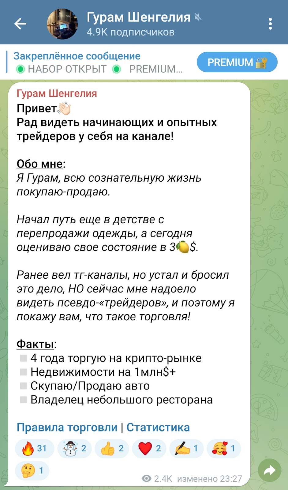 Канал Guramshengeliya появился в мессенджере Телеграмм весной 2023 года. В настоящее время на него подписано почти 5 тысяч человек. Посты набирают 700-800 просмотров. Никакой полезной информации на канале нет. Вся лента состоит из торговых сигналов, отчетов о полученной прибыли и рекламы собственных платных услуг.