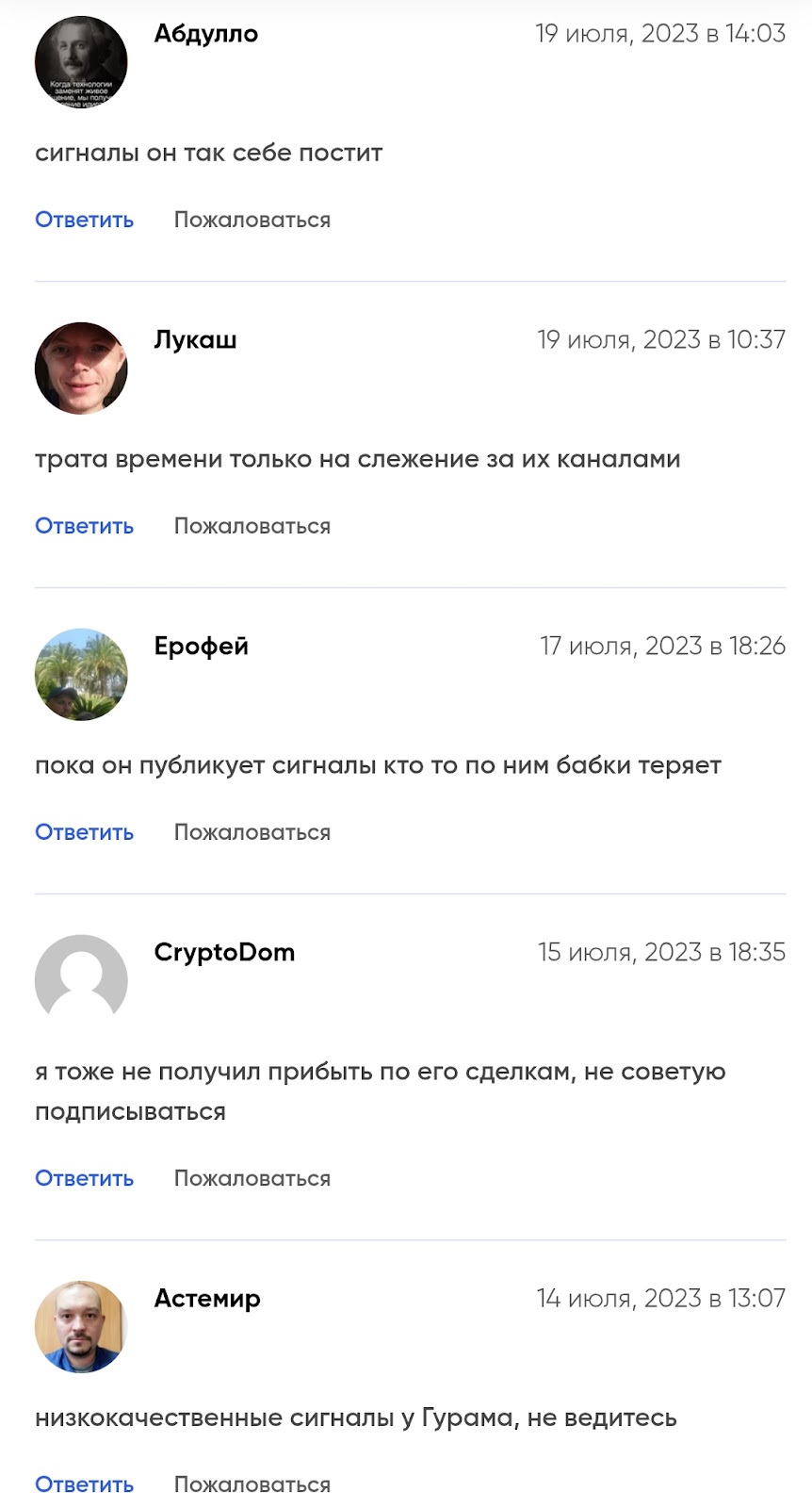 В отзывах люди утверждают, что Гурам Шенгелия дает низкокачественные сигналы, которые приводят к убыткам. Бывшие подписчики не советуют связываться с блогером.