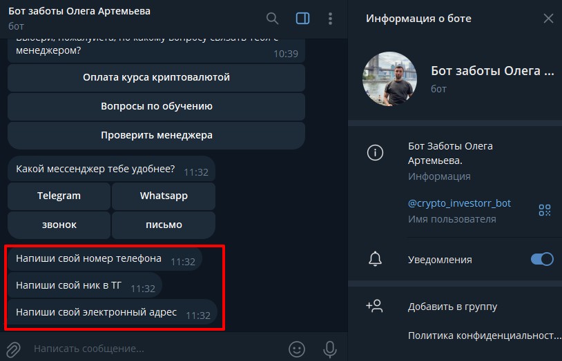 Все, кроме самого дорогого тарифа, можно приобрести в рассрочку на один год от Т-банка. Для удобства оплаты был создан «Бот заботы Олега Артемьева» (crypto_investorr_bot). В нем можно задать вопросы по обучению, проверить свободного менеджера и оплатить криптовалютой. При этом при переходе в любой раздел пользователя просят оставить контакты, по которым с ним можно связаться. Прямой коммуникации с коучем или его менеджерами нет.