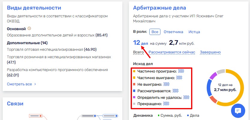 Несмотря на то, что автором курсов является Олег Артемьев, услуги предоставляет предприниматель Ясюкевич Олег Михайлович. Он оформил свою деятельность как ИП. Причем основным направлением является образование. Вот только недоверие вызывает несколько моментов. В футере сайта указан ИНН 780100501699 и город Москва. При проверке выяснилось, что деятельность зарегистрирована в Санкт-Петербурге. Причем предприниматель 12 раз был участником арбитражных дел, большую часть из которых проиграл. А это огромный минус к репутации всей команде.