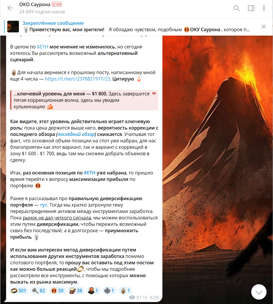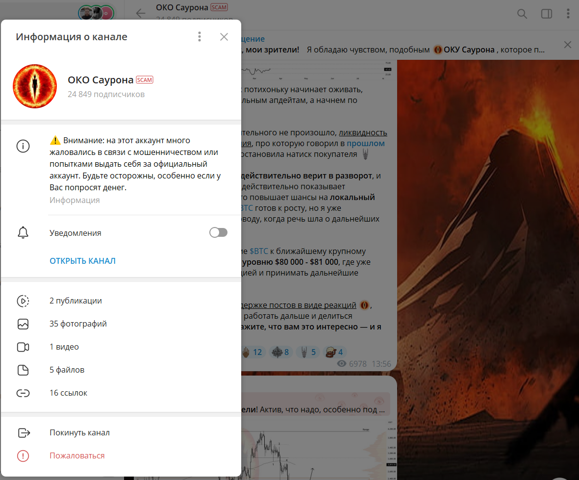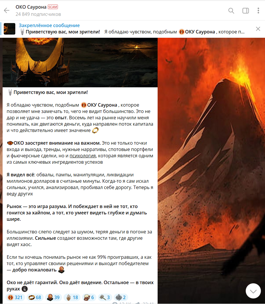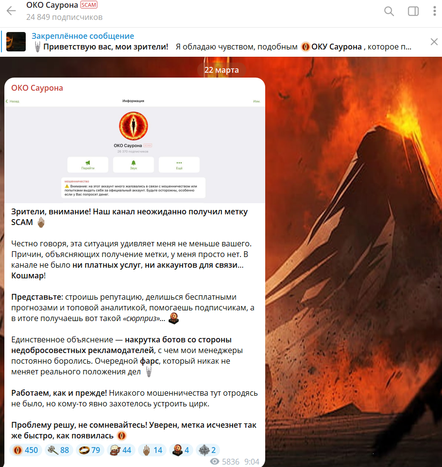 «ОКО Саурона» – типичный канал, котором делятся секретами успешных сделок и инвестиций. Как и многие другие такие паблики финансового гуру, который проводит обзор криптовалют, рынка, публикует новости и инвестиционные прогнозы. Но 22 марта он получил метку SCAM. Мы решили разобраться, почему это произошло.