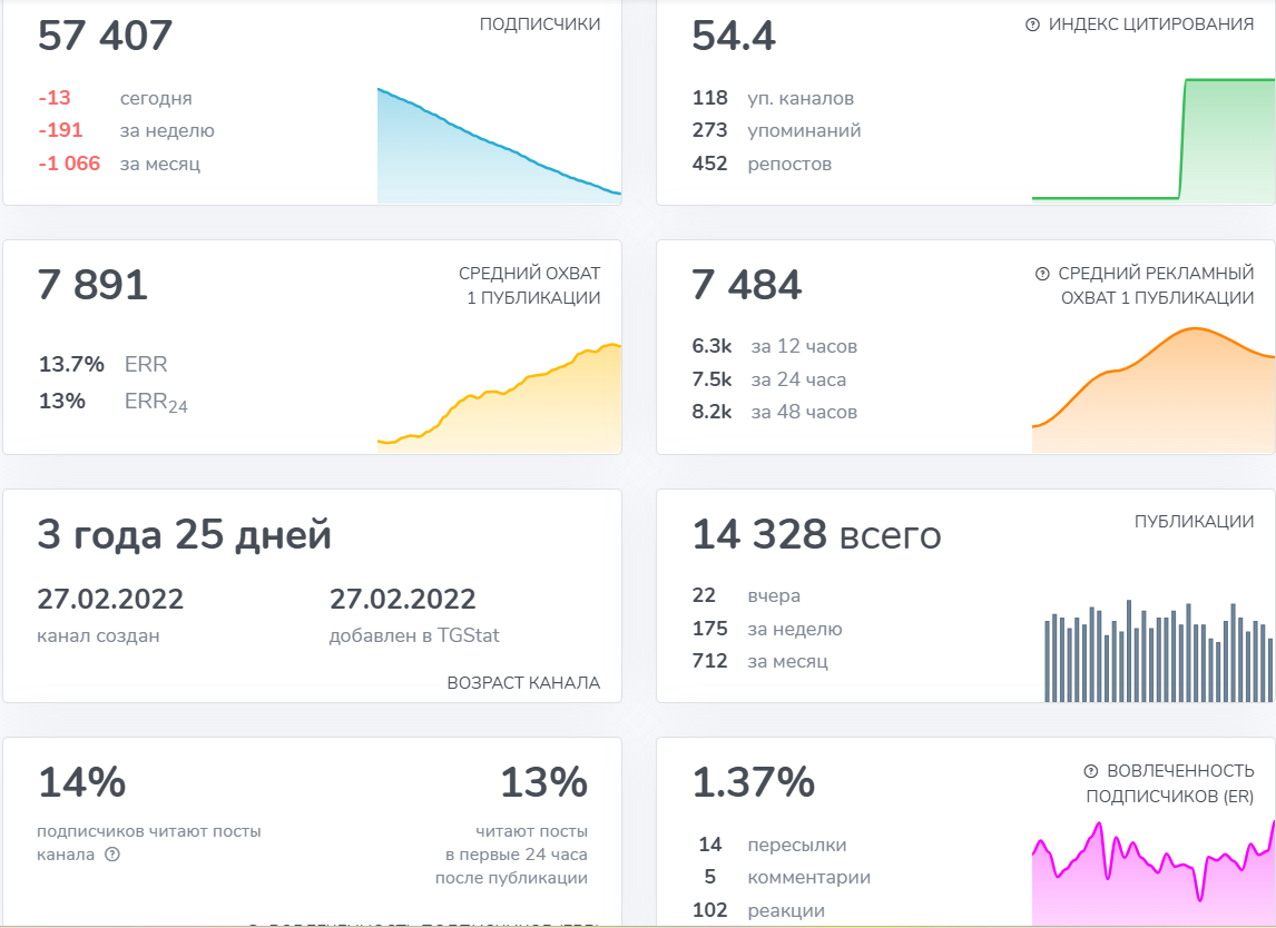 Сейчас в канал 54 407 подписчиков. Из них просматривают посты только 14%. Это говорит о коммерческом интересе и большой накрутке числа фолловеров. Чтобы казаться популярнее, админ купил фейковые аккаунты.