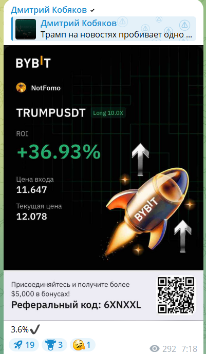 Почти каждый пост Дмитрия сопровождается рекламой биржи ByBit и реферальным кодом с приглашением присоединиться к проекту по ссылке Кобякова. Демонстрировать доказательства своего профессионализма и заработка трейдер не спешит, на его каналах нет информации о лицензиях или каких-либо документах Кобякова.