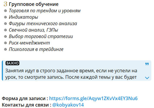 Чтобы записаться и узнать стоимость участия в курсах, нужно лично связываться с Дмитрием в его канале kobyakov14.