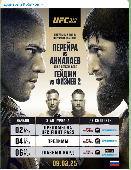 Кобяков фанат UFC и также часто постит анонсы различных матчей и турниров, которые он будет смотреть и делится с подписчиками, за кого болеет в соревнованиях.