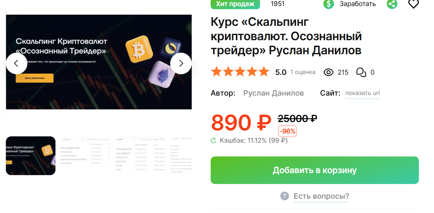 Руслан Данилов продает несколько своих платных продуктов на сайте TraderFond — популярном ресурсе для покупки материалов в сфере криптовалют, а также в своем телеграмм-канале. Основной курс, который выставлен на продажу за 890 рублей у Ruslan Danilov — «Скальпинг Криптовалют Осознанный Трейдер», собравший сильно негативные отзывы.