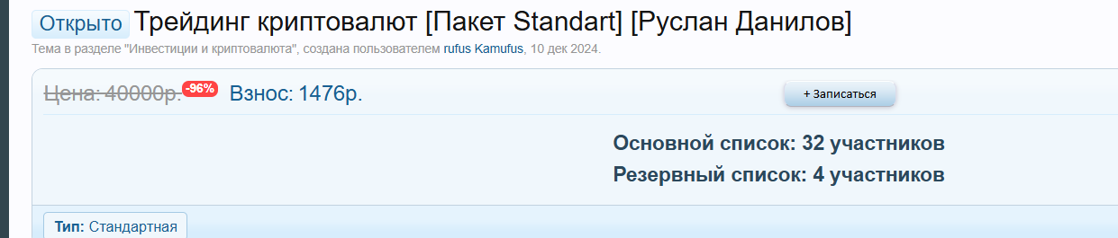 В начале 2025-го был представлен еще один курс по трейдингу криптовалют — пакет Standart Руслана Данилова стоимостью 1476 рублей со скидкой и состоящий из 36 участников.