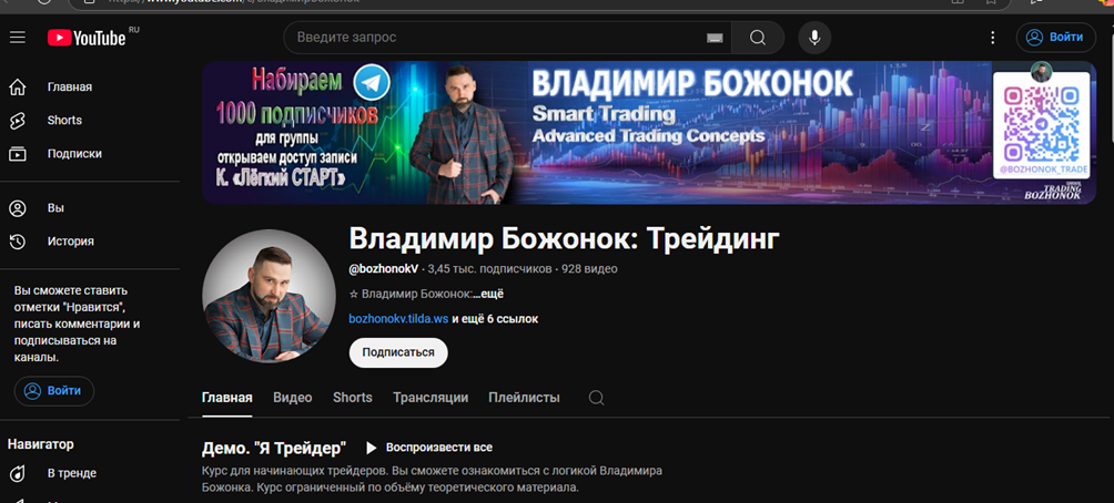 YouTube-канал Владимира Божонка предоставляет образовательные материалы для трейдеров, включая обзоры рынка и ответы на вопросы по трейдингу. Канал также предлагает курс для начинающих, где можно ознакомиться с авторской методикой трейдера. На момент нашего обзора аудитория насчитывает 3,45 тысячи подписчиков. Первое видео было опубликовано в 2022 году.