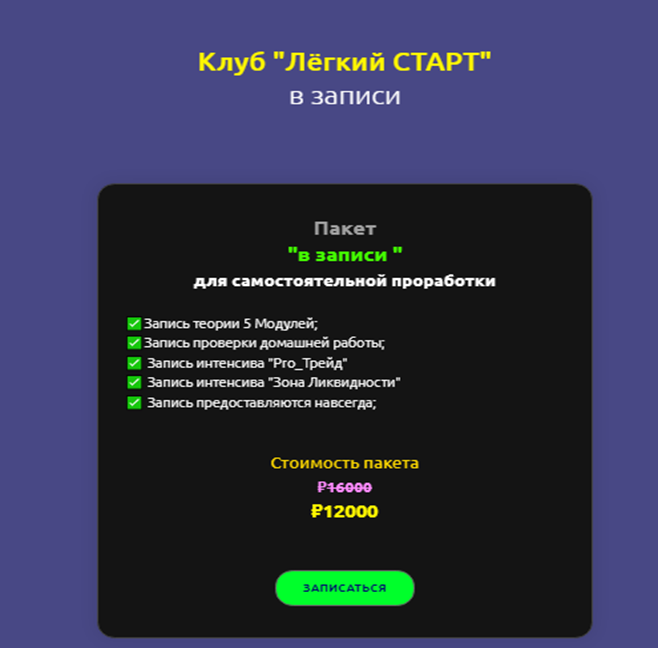- трейдер предлагает разнообразные курсы, начиная от базовых и заканчивая продвинутыми программами. Формат обучения стандартный, но отсутствие открытых отзывов от реальных учеников и использование смонтированных видеороликов с отзывами на сайте тоже не вызывает доверия;