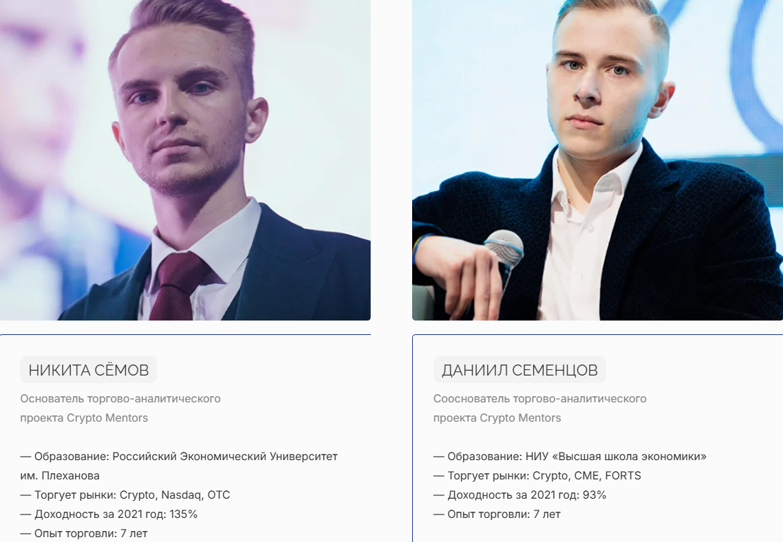 CryptoMentors — образовательный проект от Никиты Сёмова и Даниила Семенцова, опытных трейдеров на криптовалютном и других рынках, которые, по их заявлениям, решили передать накопленные знания сообществу с уклоном на актуальные рыночные условия.