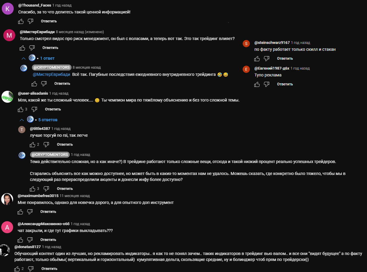 На Ютубе комментарии открыты, здесь мнений можно найти уже гораздо больше. В основном подписчики благодарят за интересные видео с полезной информацией и нередко задают вопросы по материалу. В откровенном обмане авторов здесь обвиняют редко, однако замечания по рекламе, стоимости и качеству обучения встретить можно. На некоторые комментарии отвечают сами авторы.
