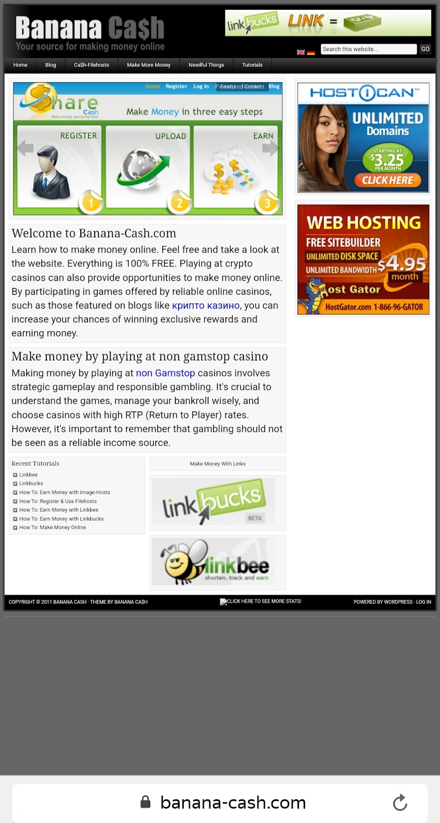От некоторых способов заработка на сайте лучше воздержаться. Дело в том, что на первой же странице нас встречает баннер с призывом заработать в онлайн-казино, что незаконно во многих странах.
