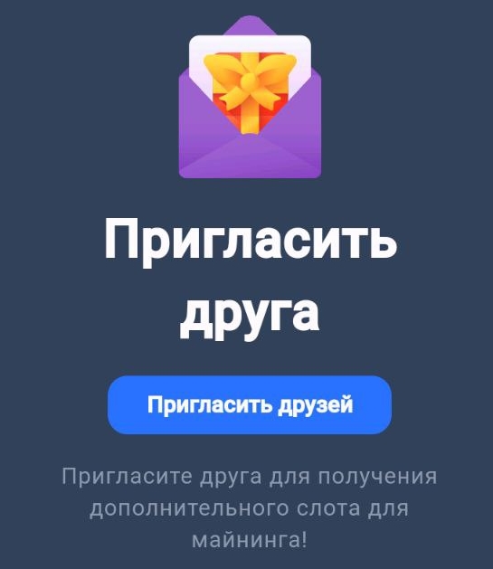 Для эффективного майнинга нужны слоты – на них можно заработать в игре за приглашения друзей либо купить за 50 тыс. очков (что эквивалентно 5 выполненным заданиям – допустим, 4 подписки на каналы кликера и 1 ежедневное задание).