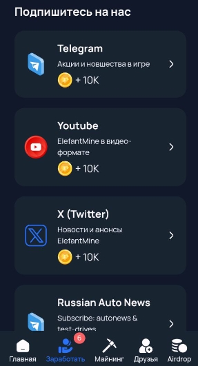 Какие есть задания в игре? Подписки на каналы elefantmine (в том числе RussianAutoNews), отдельным блоком идут ежедневные задания – за все задачи кликер платит по 10 тыс. баллов.
