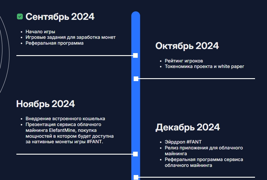 Имеет ли будущее elefant mine? Тапалка elefant окружена кучей обещаний – нативный токен FANT можно будет потратить на приобретение реальных облачных мощностей для майнинга. На сайте есть дорожная карта, судя по которой на октябрь 2024 года придётся определение самых успешных игроков и разглашение токеномики монеты. В ноябре в приложении появится кошелёк, а также можно будет узнать больше информации про облачный майнинг слоновых монеток.