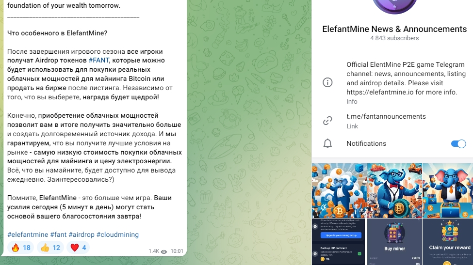 Также у игры elefantmine телеграмм есть официальные каналы в телеграмме и на YouTube. В элефант майн телеграм ElefantMine News and Announcements более 4,8 тыс. подписок, просмотр постов примерно соответствует данном количеству. Новости проекта публикуются сразу на двух языках в одном посте – английский, затем русский. Комментарии отключены, что не даёт возможность оценить мнение пользователей о проекте, а процент реакций к постам очень низкий в сравнении с количеством просмотров.