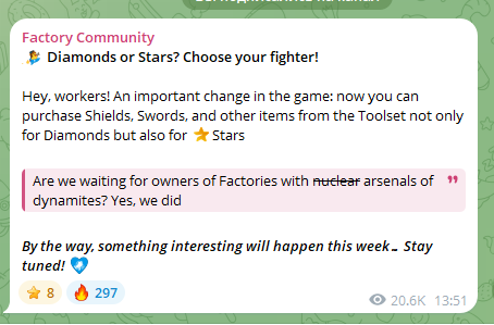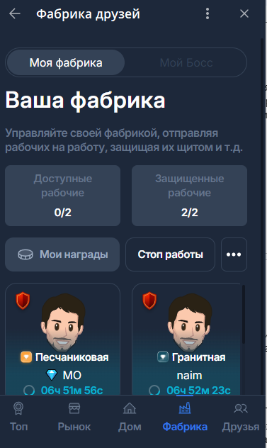 Один из секретов в игре Фабрика в Телеграме заключается в том, чтобы регулярно заходить на рынок, если там нет рабочих без щита. Перечень обновляется очень часто. Рабочих могут перекупать, а щиты, если игрок их устанавливает, легко ломаются. Прокачать рабочего или как-то его защитить от покупки другим игроком невозможно.