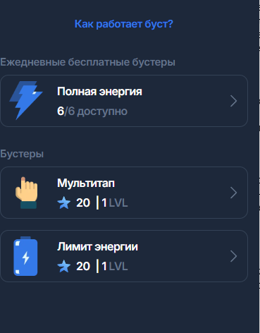 Любые бустеры покупаются за звезды Телеграма. Их всего 2 – это мультитап и лимит энергии. Каждый обойдется в 20 звезд.