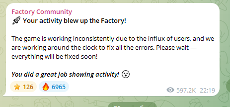 В Factory Chat в Телеграме уже более 5,5 млн. пользователей. Есть отдельный бот Help Fabrika, куда можно отправить любой вопрос разработчикам. Отдельно для пользователей есть @fabrika_4at. Там 400 000 участников. Но в основном идет только подписка на канал, которая является одним из заданий в игре.