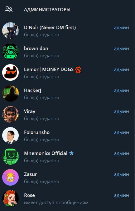 Чаты и каналы администрируют ранее неизвестные пользователи. Никаких сведений сверх аватарок и имен нет.