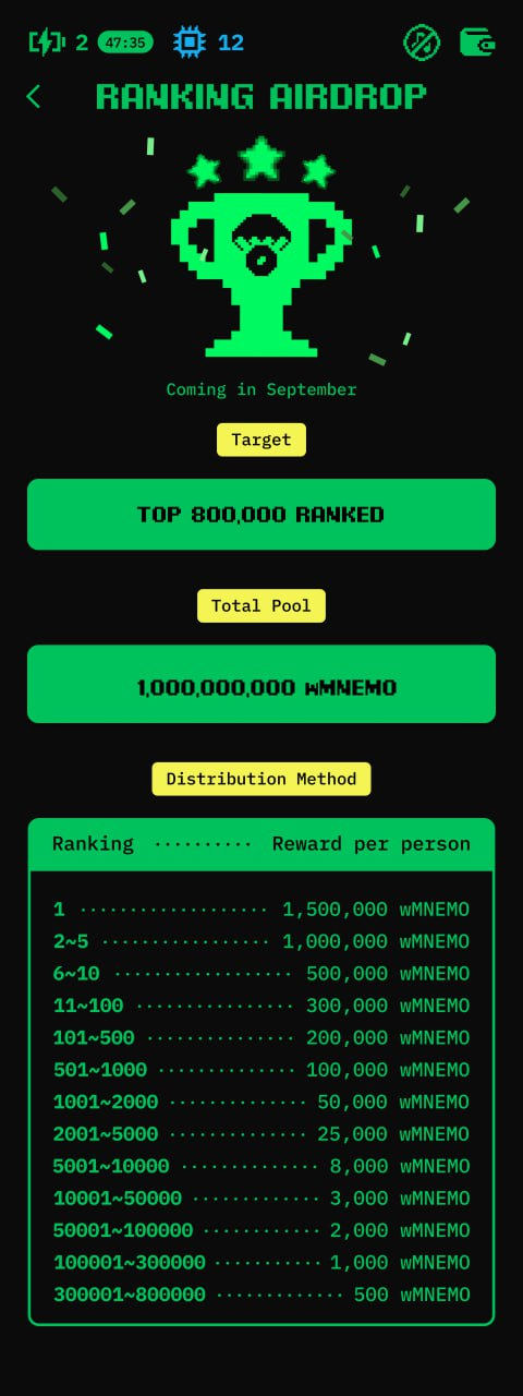 Снапшоты для дропа были сделаны 23 сентября, после чего награда в 1 миллиард MNEMO была распределена между 800 тысячами активных игроков. Самые сочные дропы забрал топ-5000 пользователей, причем первый в лидерборде получил аж 1,5 миллиона токенов.