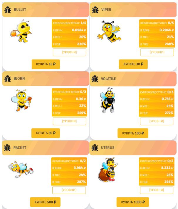 Судя по отзывам о HoneyGame, в игре предлагается несколько пчел, которые отличаются своей стоимостью и доходностью. Самая простая стоит 15 рублей, а самая дорогая — 1000. Доходность достигает 42% в месяц, однако отзывы о HoneyGame это не подтверждают.