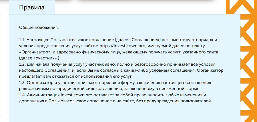 Проект Инвесттаун предусматривает постоянную активность пользователя. Если аккаунт не был активным 10 дней подряд, за каждый неактивный день со счета списывается 3% платежных баллов. Администрация оставляет за собой право в одностороннем порядке изменять курс игровой валюты.В правилах игры разработчики Invest town полностью снимают с себя ответственность за любые неполадки в игре. Это значит, что, в случае сбоя платформы, игрок может потерять все средства со счета, и все его жалобы окажутся просто проигнорированными.