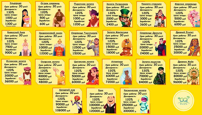 Описание игры КладоискателиКак пишут отзывы, Кладоискатели не балуют клиентов большой прибылью. Они используют сбалансированный маркетинг. Минимальный вклад в проект составляет 250 рублей. При внесении такого депозита администрация обещает выплатить прибыль в размере 5% в течение 12 дней.