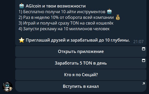 Проект AGIcoin запустили в июле 2024 года, за его созданием стоят неизвестные, о которых нет достоверной информации. Преподносится как игра, в которой, в отличие от аналогов, не нужно ждать дроп, а можно сразу конвертировать заработанные очки в криптовалюту TON. Как показывают обзоры AGIcoin, сделать это не так просто.