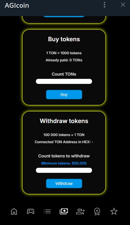 В AGI Coin можно пополнять счет в TON, за которые те, кто не может привлекать рефералов, могут покупать уровни. Вывод заработанных очков в криптовалюту производится прямо в игре, для вывода 1 TON нужно отдать 100 000 очков. При этом минимум для вывода составляет 5 TON.