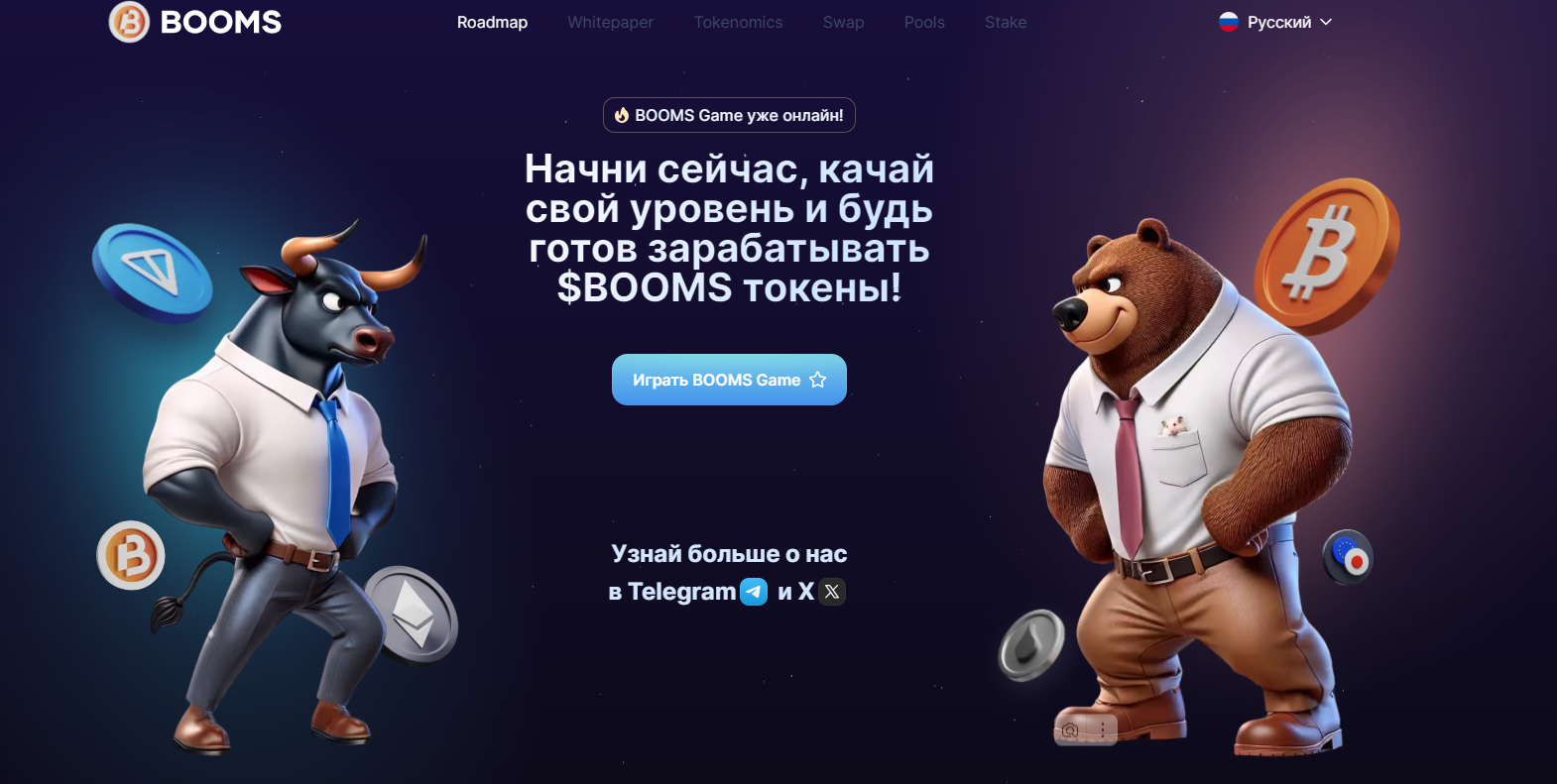 Бумс ио поддерживает русский язык, хотя очевидно, что тапалка скорее принадлежит иностранным разработчикам. Пока на платформе доступен только раздел с дорожной картой проекта. Разделы с токеномикой, данными по стейку и так далее находятся на стадии разработки.