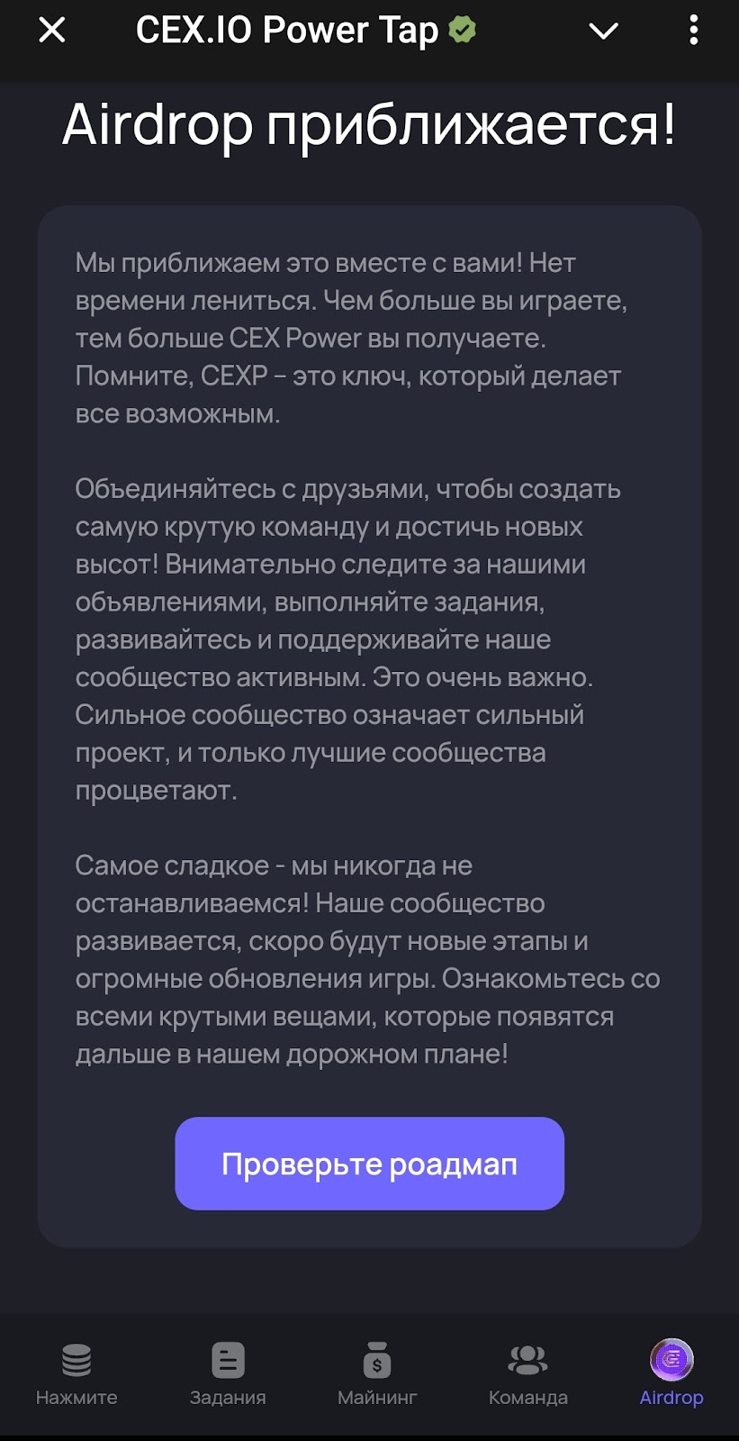 В последнем разделе тапалки Cex Io Power Tap находятся условия аирдропа Cex Io. Подробностей пока нет, но известно, что будет проведено несколько сезонов, в которых старые игроки усилят свои позиции, а новые получат шанс добыть токены Cexio с еще большим функционалом. В данный момент стартует второй сезон игры в Cex Io бот.