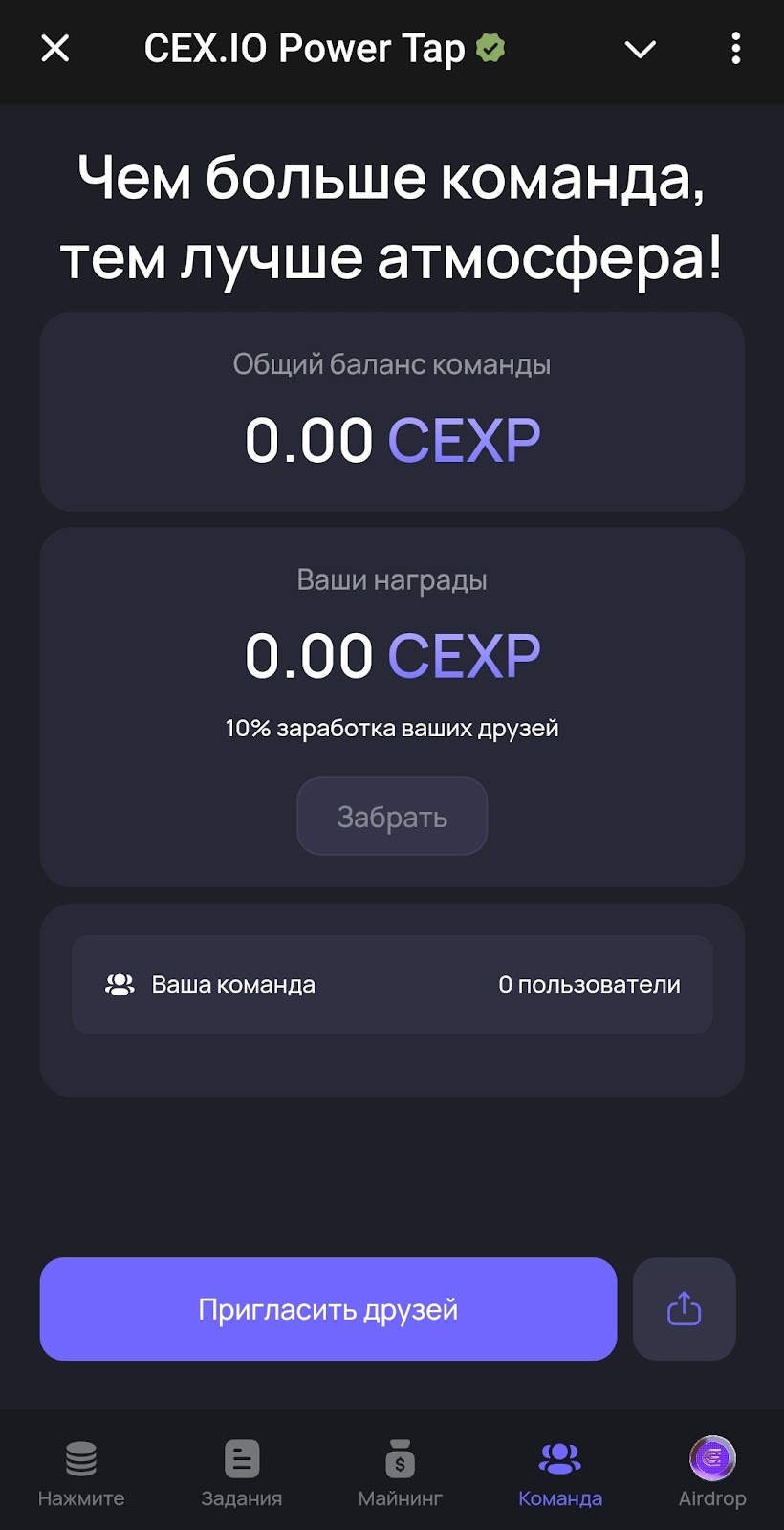 Раздел Команда — это реферальная программа в Cex Io Tap bot. Приложение подсчитывает общее количество монет Cex Io, заработанных коллективно. 10% от общего банка может получить партнер, который приглашает рефералов.