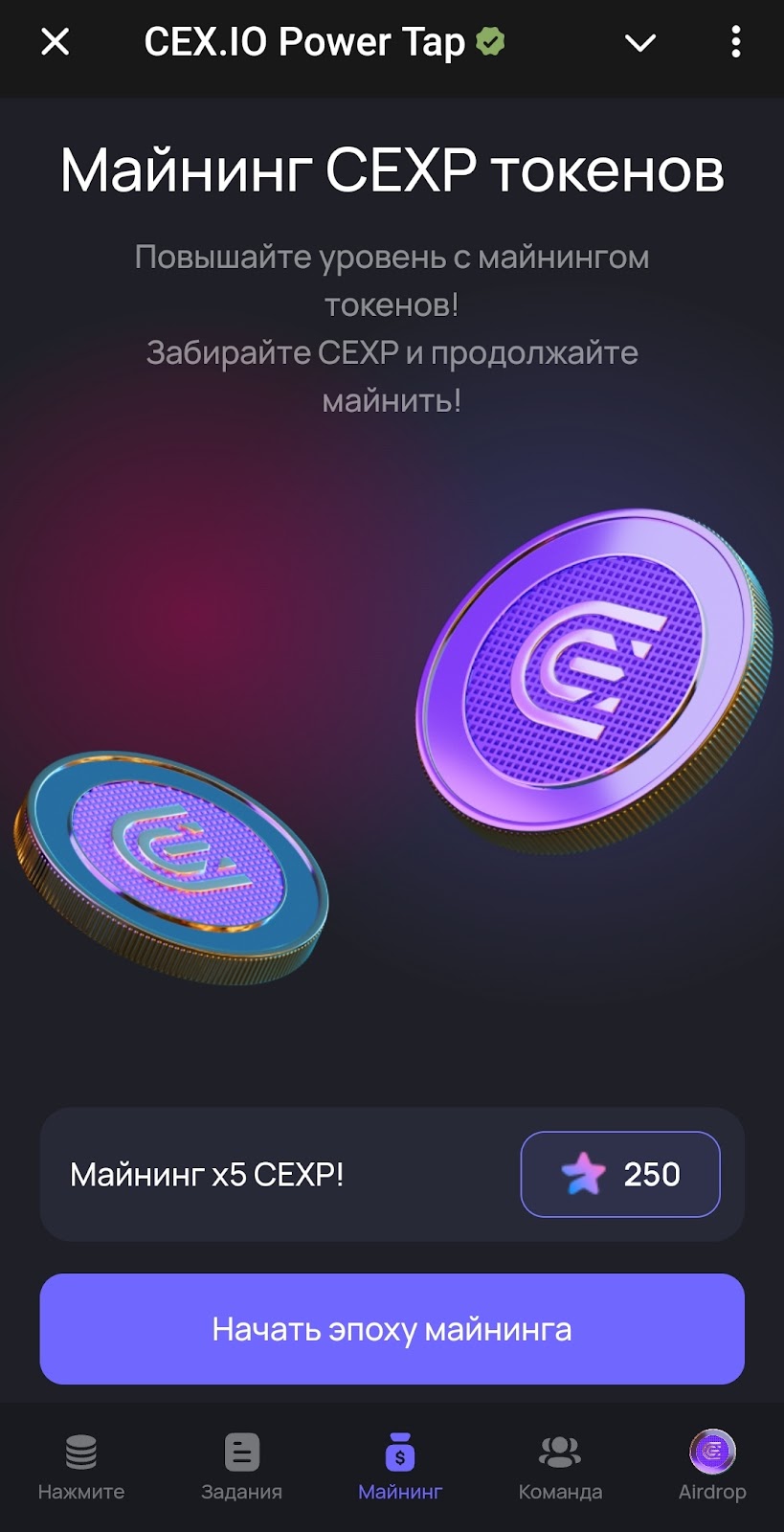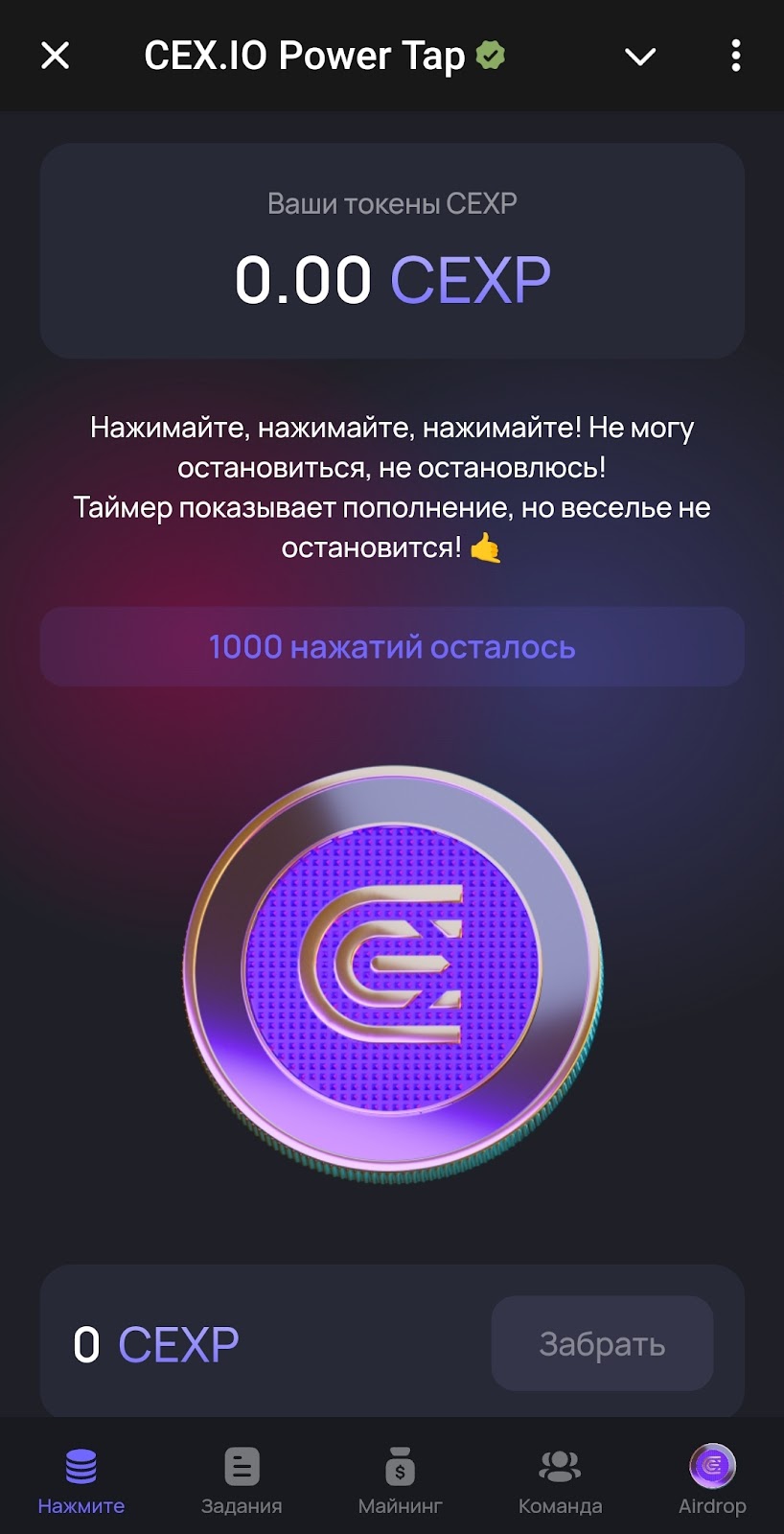 Майнинг в Cex осуществляется на главном экране. Пользователь получает 1000 энергии, то есть может сразу же натапать 1000 поинтов. Обязательно нужно клеймить монеты, собранные с кликера, тогда они будут зачислены на баланс.