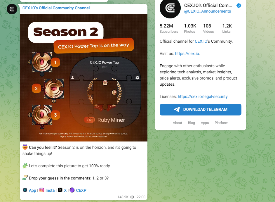Телеграмм канал тапалки Cexp собрал 5 млн пользователей. Этот же канал используется для продвижения биржи, то есть он создан давно. Посты собирают 300-400 тысяч просмотров, чата нет. Сама биржа находится на сайте Cex Io. Есть аккаунты в Инстаграм, Фейсбук и Твиттере.