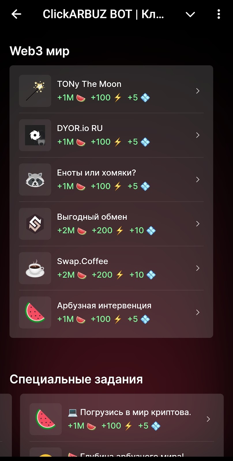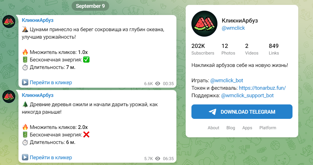 За задания в кликере Кликни Арбуз дают арбузы, энергию и очки исследования. Награды очень щедрые, но за отписку снимают штраф в двойном размере.