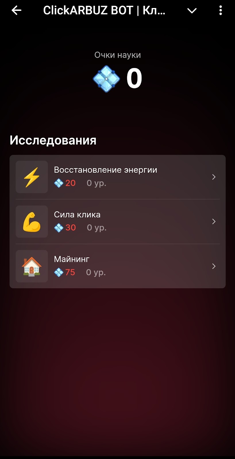 В исследованиях за заработанные баллы можно дополнительно прокачать энергию, майнинг и силу клика.