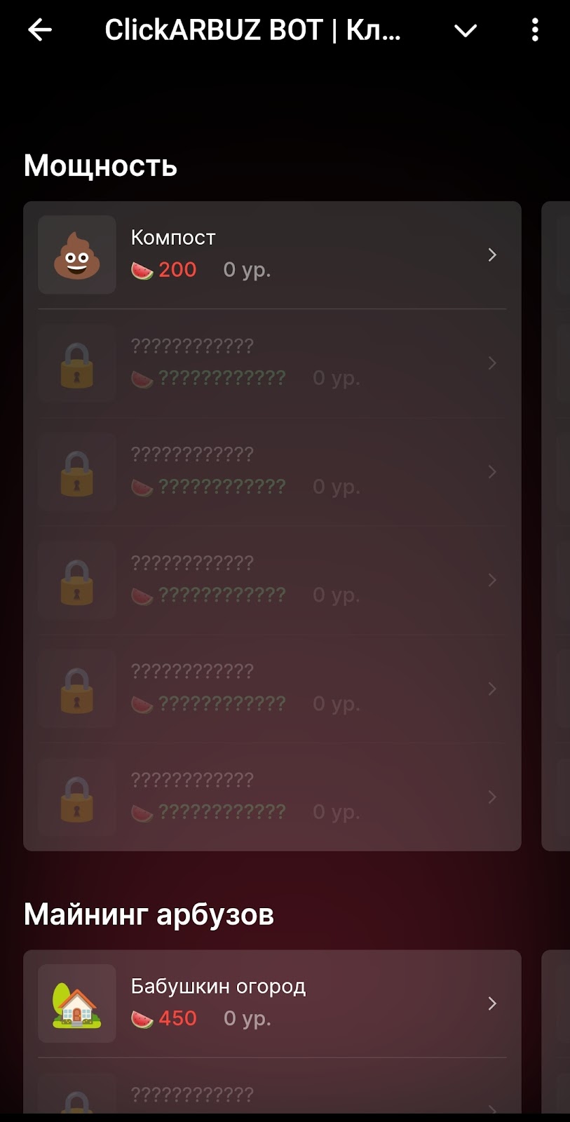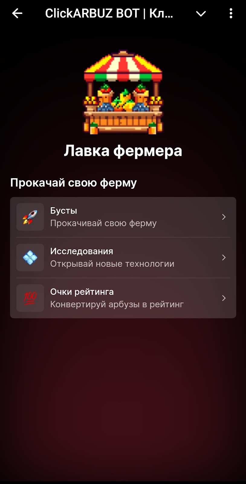 Бусты находятся в лавке фермера. В ТГ Кликни Арбуз бот представлены несколько видов прокачки аккаунта.