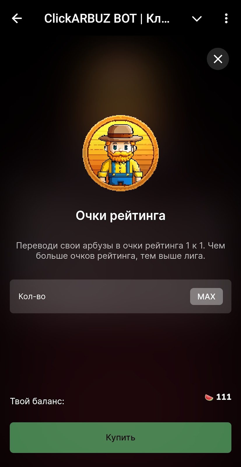 Конвертация очков в рейтинг находится в последней вкладке Clickarbuz bot. Обмен происходит 1 к 1.